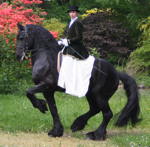 Ein Durchstarter der Sonderklasse. Im Jahr 2000 wurde er nicht nur Körungssieger, sondern auch Sieger der Hengstleistungsprüfung. Im Jahr 2001 wurde er bereits drittbester der Althengste auf der Körung in Dillenburg. Im Jahr 2002 setzte er sich ganz an die Spitze und wurde Tagessieger der Althengste. Keinem anderen Friesen war es möglich, sich so ausdrucksstark und elastisch zu präsentieren. Im Jahr 2003 wurde er Vize-Bundes-Champion, im Jahr 2004, 2005, 2006, 2007 und auch 2008 setzte er noch einen drauf und wurde jeweils Bundes-Champion der Althengste. Seine Championatserfolge verdankt er nicht nur seinen Eigenleistungen, sondern auch den hohen Erfolgen in der Zucht. Hier hat er schon einige Stern- und Modellstuten sowie einen gekörten Hengst hervorgebracht. Keimpe ist der erste FPZV-Deckhengst, der aufgrund seiner außergewöhnlichen Leistungen in der Zucht bereits zu Lebzeiten das Prädikat "Prämienhengst" erhalten hat und als erster Hengst in Deutschland zum Elitehengst erklärt wurde. Er ist ein besonders typvoller Hengst mit viel maskulinem Ausdruck, der es versteht, sich in schöner Aufrichtung, enormer Aktion sowie elastischen Schwung mit viel Schub aus der Hinterhand zu bewegen. Seine Bewegungen sind taktrein, der Schritt schreitend mit viel Untertritt. Im Galopp verfügt er über eine fortwährende Bergauftendenz mit viel Fleiß. Sein Trab ist einfach sensationell. Seine überragenden Grundgangarten ermöglichten ihm schon im Jahr 2001 erste Platzierungen in Dressurpferdeprüfungen der Klasse A. Bis zum heutigen Tag hat er schon viele Siege und Plazierungen in der Klasse L + M erreicht. |